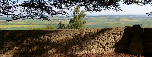 14:00 Blanche-Eglise. Net 6km asfalt gehad, en nog 2 voor de boeg ook. Lunch op een bankje bij de kerk, in de schaduw van een rode beuk. Half stokbrood en een blikje vis. Heerlijk. Nu effe liggen in het gras. Er is hier een gîte naast de Mairie. Alimentation niet gezien. Bij de kerk is een waterkraan. De kerk is trouwens helemaal niet wit.
