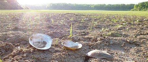 19:34 Gigantische mosselschelpen in het drooggevallen Etang de Brin.