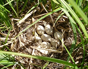 11:45 Eend opgeschrikt van haar nest. Maar liefst 10 eieren. Dat is de moeite. Vogezen goed in zicht.