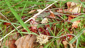 13:30 Gewond zwijn ligt midden op het pad. Hij schrikt op als ik om de hoek kom, begint te briesen, maar vlucht dan kreupel weg, en laat een bloedspoor achter.