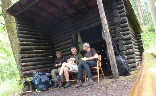 10:50 Mooie kampeerplek, een kilometer voor Fribourg. Een vijver, een grasveld, een soort refuge, afdak, picknicktafels. Van wie is dit? Het huisje is op slot. Binnen zal ook zeker water zijn. Buiten niet.